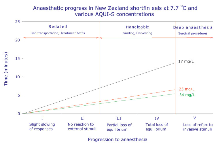 In the initial phase animals have lost equilibrium but retain some swimming motion. On handling, no struggling is apparent, although animals will display some awareness if removed from the water. In the later phase animals have lost equilibrium and swimming motions have ceased.